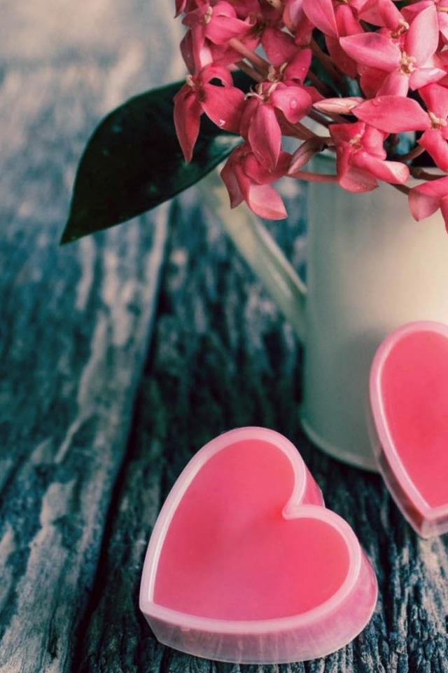 Wallpaper Pink flowers in a white vase and two pink hearts