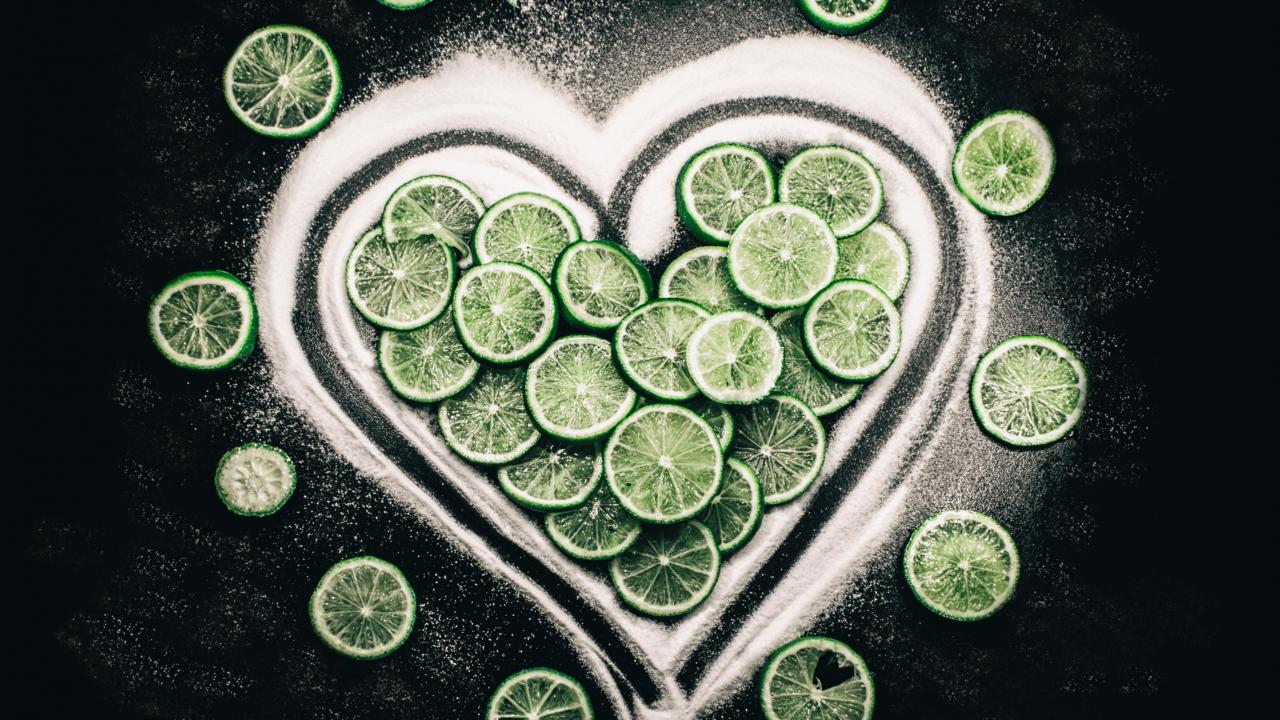 Wallpaper Heart made of sugar and circles of green lime on a black background