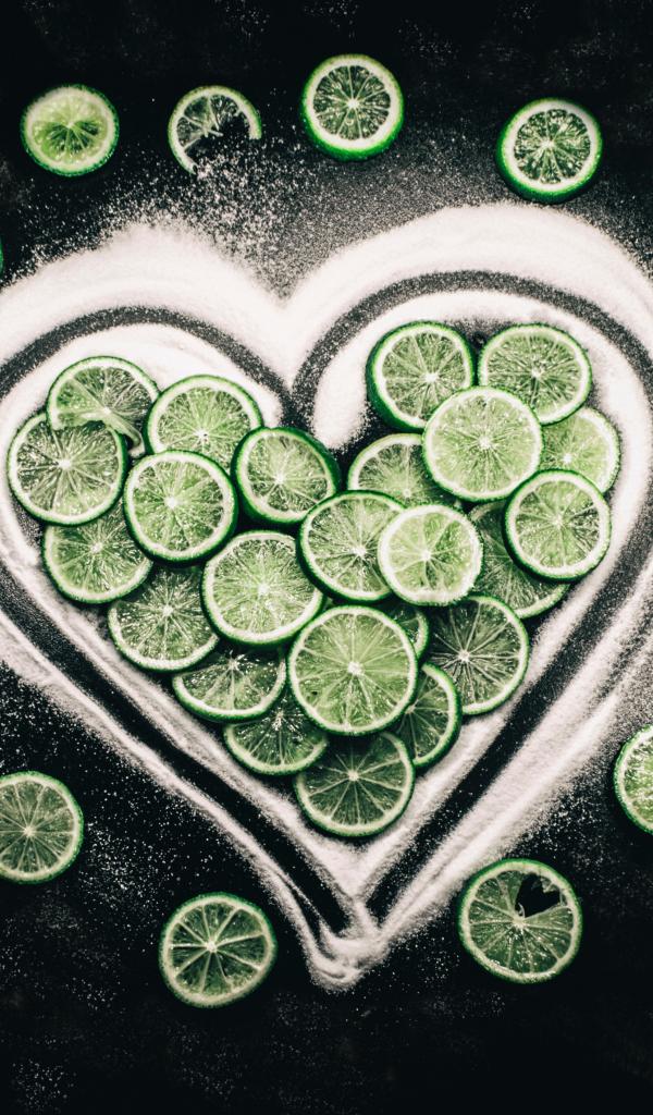 Wallpaper Heart made of sugar and circles of green lime on a black background