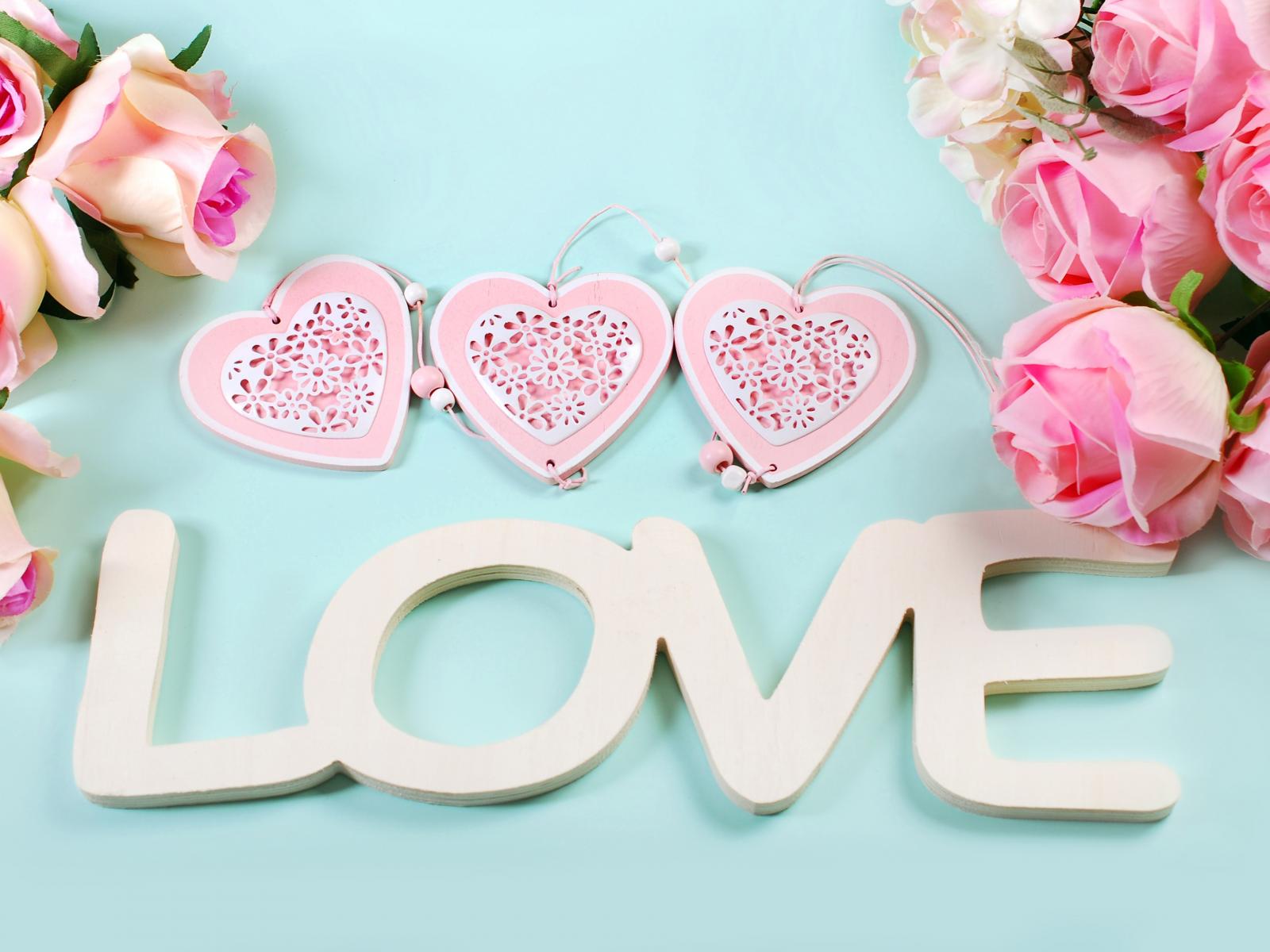 Wallpaper Pink roses, hearts and a white inscription Love in English