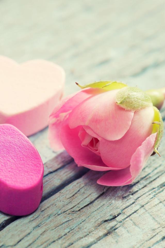 Wallpaper Two pink hearts and a pink rose lie on a wooden surface