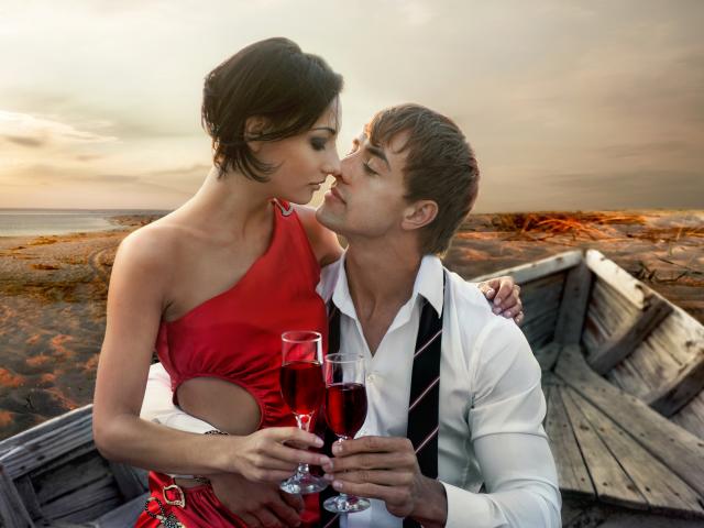 Wallpaper A loving couple sitting in a wooden boat with glasses of wine
