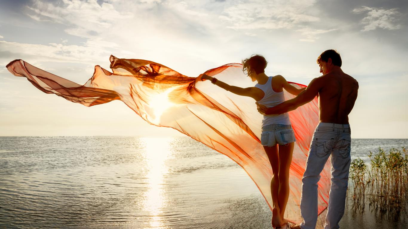 Wallpaper Young couple in love walking near the sea at sunset