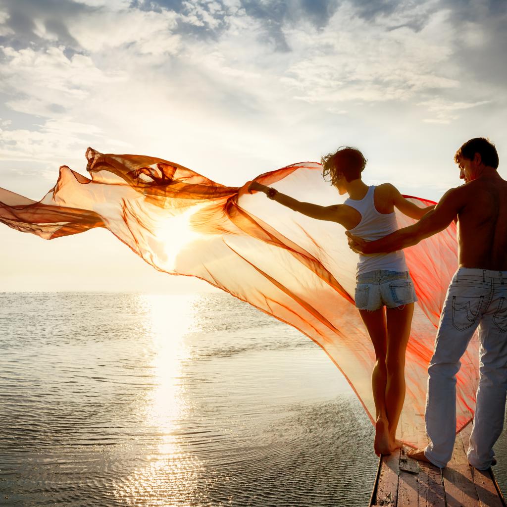 Wallpaper Young couple in love walking near the sea at sunset