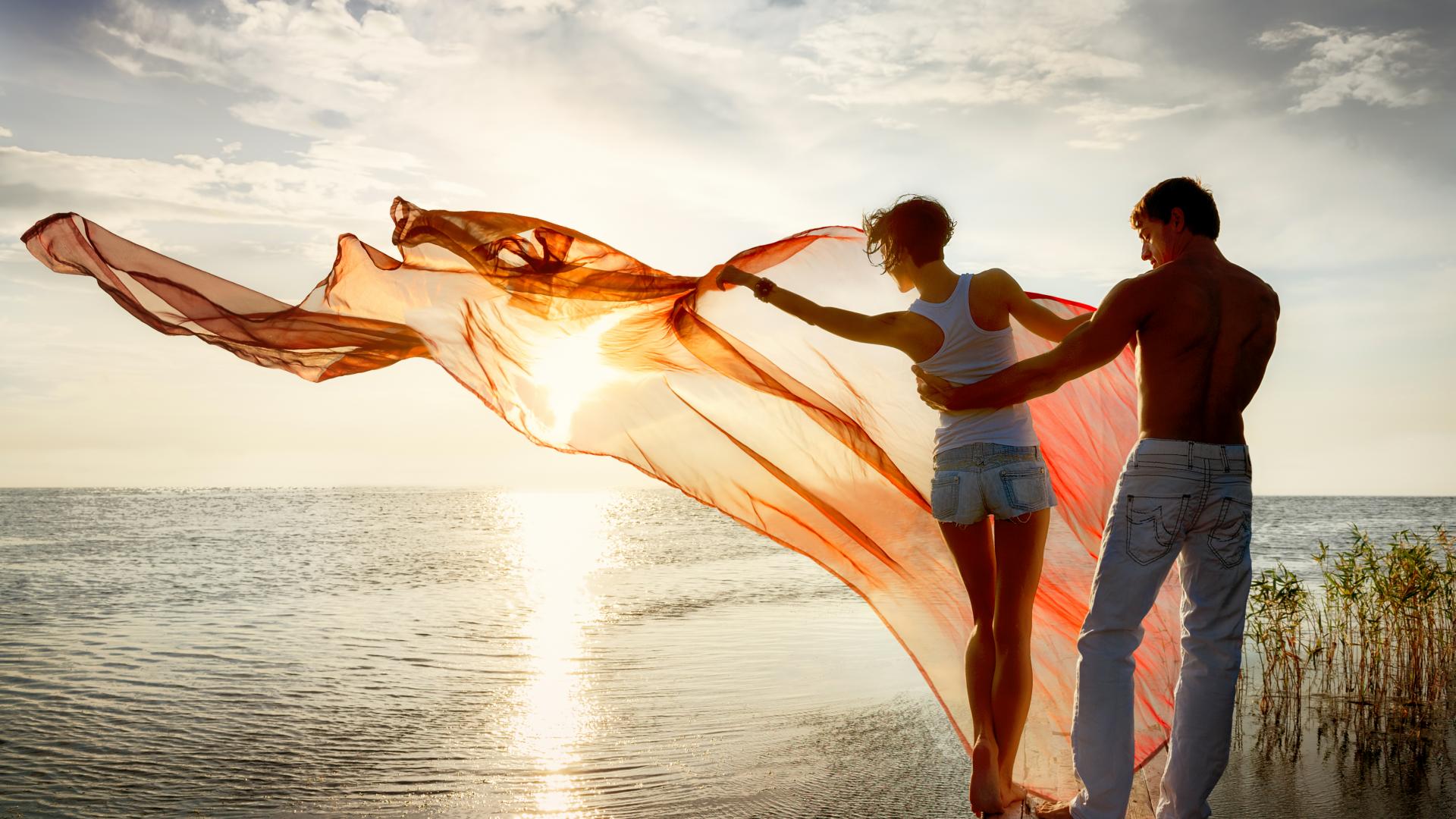 Wallpaper Young couple in love walking near the sea at sunset