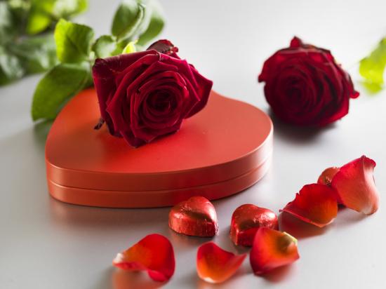 Wallpaper Large red box in the shape of heart with chocolate sweets and red roses