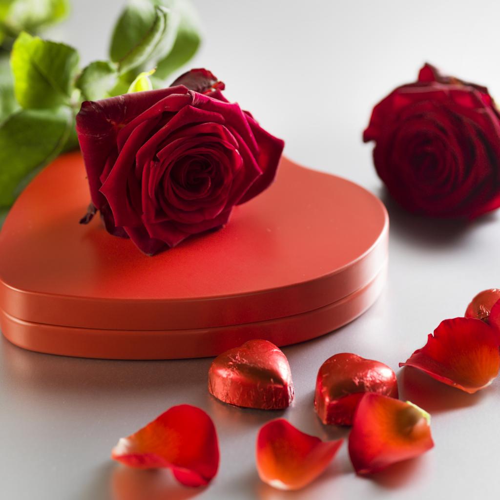 Wallpaper Large red box in the shape of heart with chocolate sweets and red roses