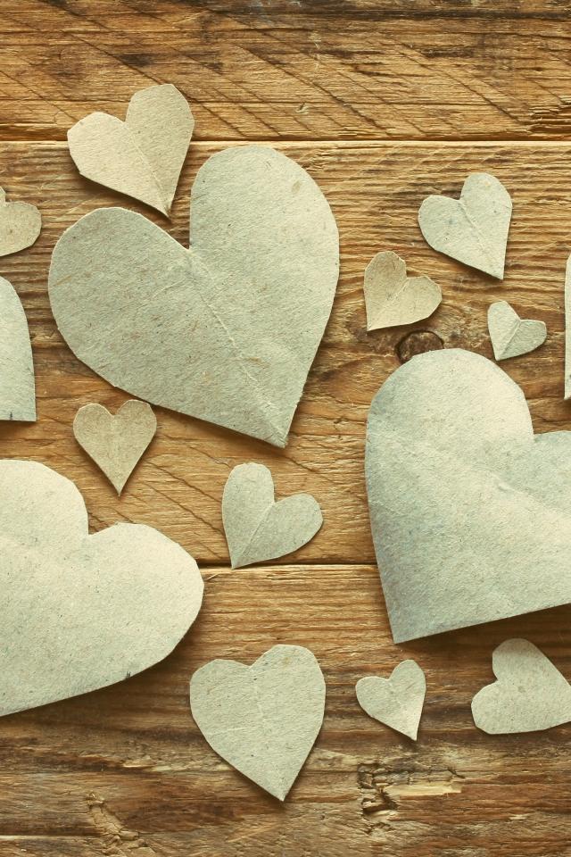 Wallpaper Red heart made of chocolates on a wooden background with paper hearts