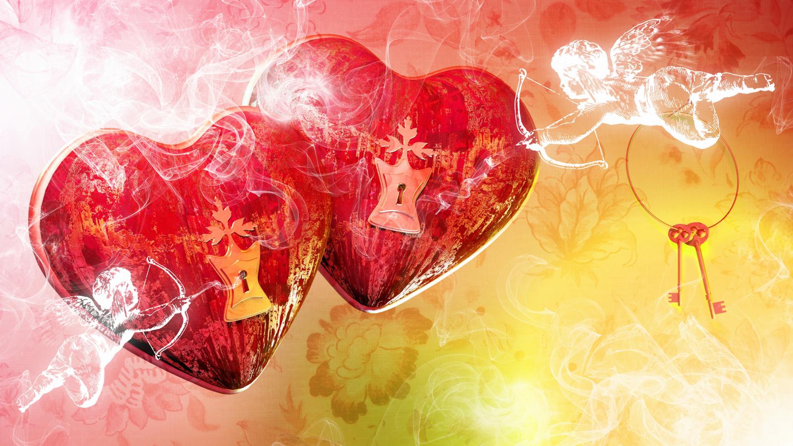 Wallpaper Two big red hearts with keyholes and cupids