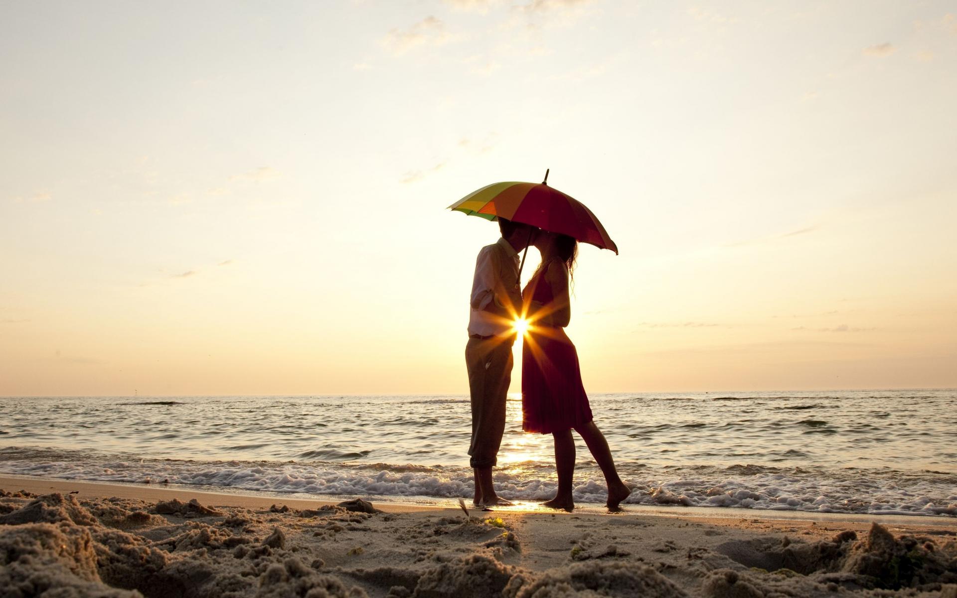 Wallpaper A loving couple on the beach is standing under an umbrella at sunset