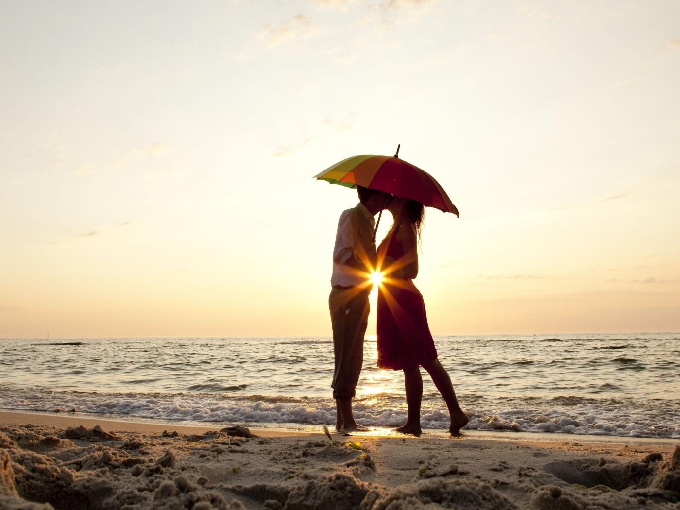 Wallpaper A loving couple on the beach is standing under an umbrella at sunset