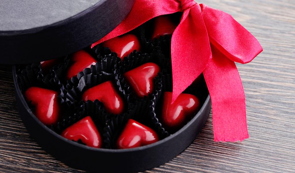 Wallpaper A box of chocolates in the shape of heart with a red ribbon