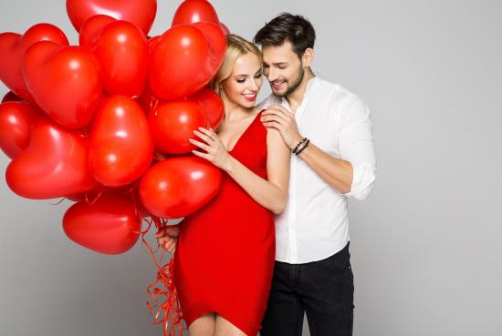 Wallpaper Loving couple with red balloons in the shape of heart