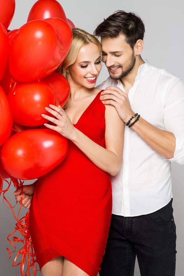 Wallpaper Loving couple with red balloons in the shape of heart