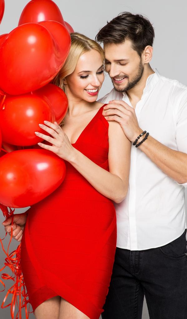 Wallpaper Loving couple with red balloons in the shape of heart