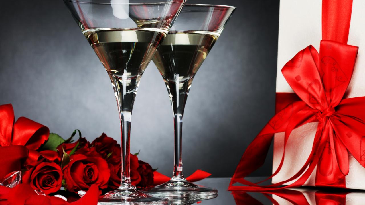 Wallpaper Two glasses with martini, a gift and red roses for your beloved