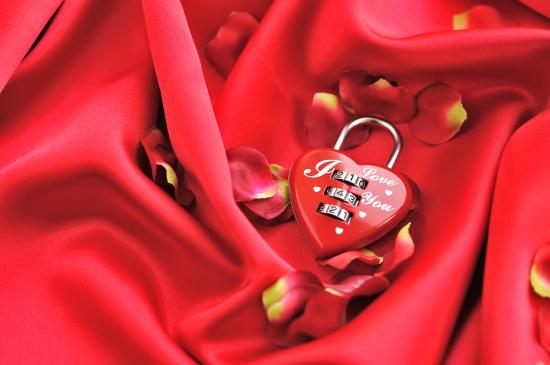 Wallpaper Coded lock in the shape of heart on a red background with rose petals