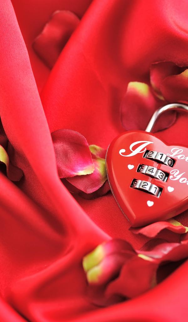 Wallpaper Coded lock in the shape of heart on a red background with rose petals