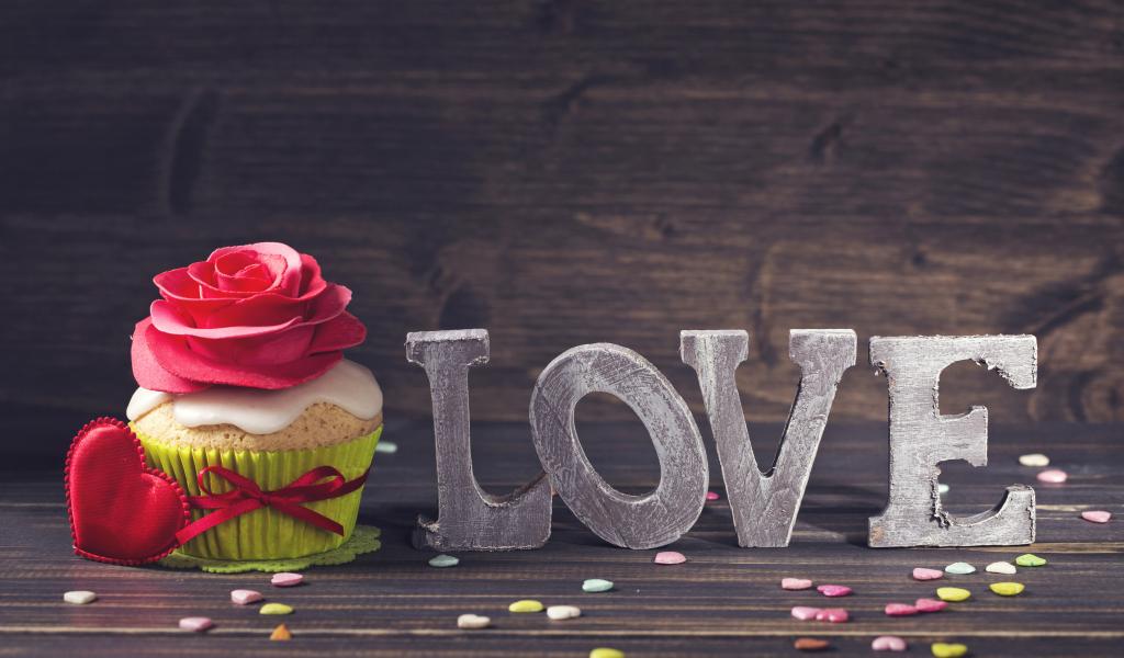 Wallpaper Inscription Love with a beautiful cupcake with a red heart