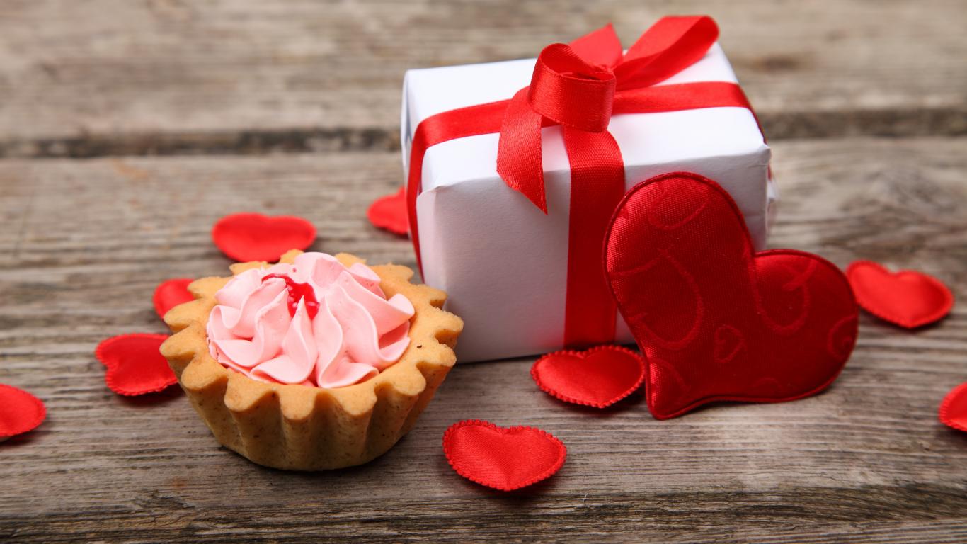 Wallpaper Gift with red hearts and a cake on the table