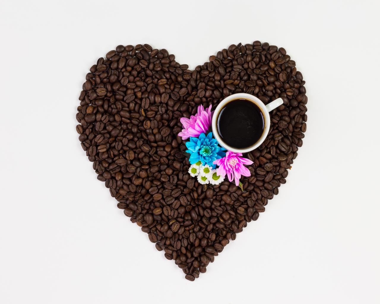 Wallpaper Heart made of coffee beans with a cup on a white background