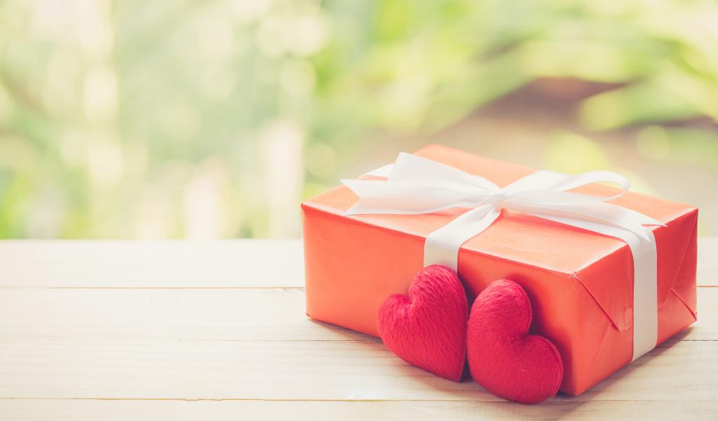 Wallpaper Gift with red hearts on a wooden table