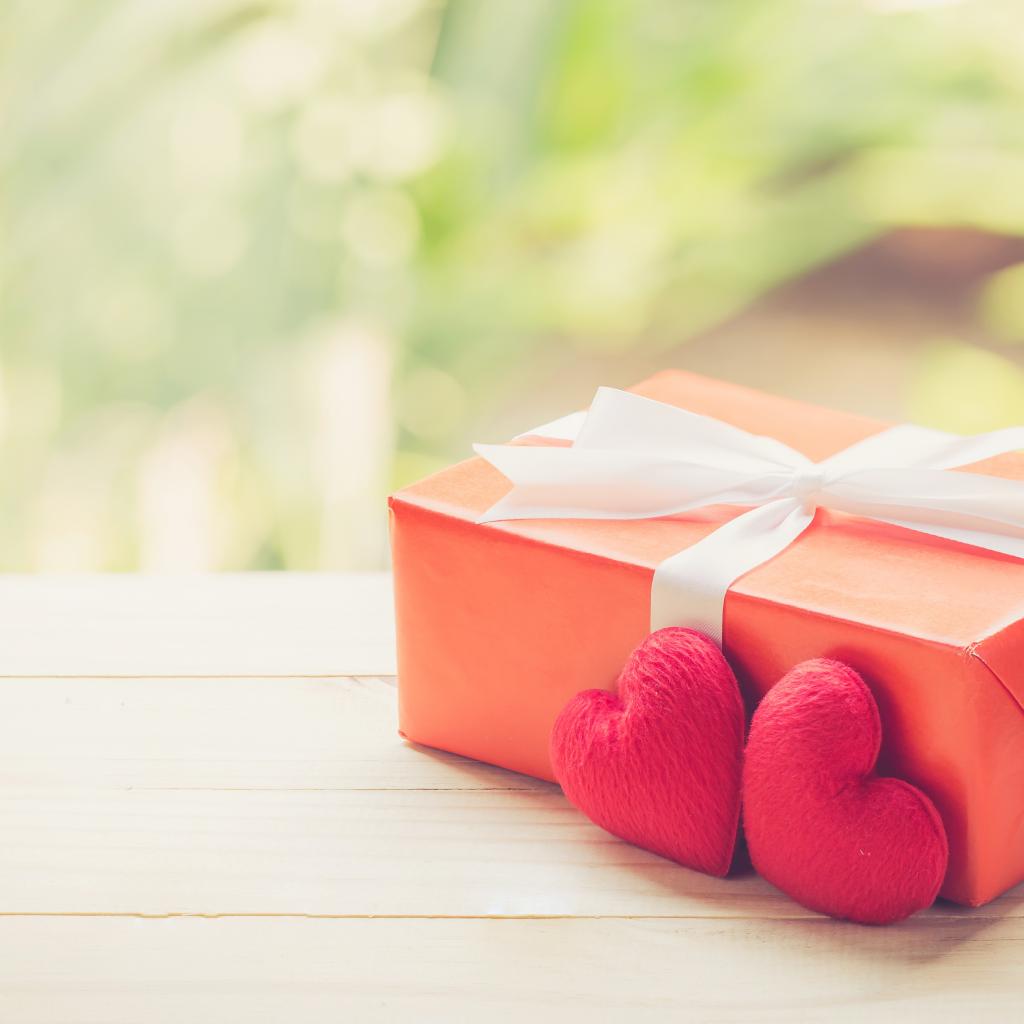 Wallpaper Gift with red hearts on a wooden table
