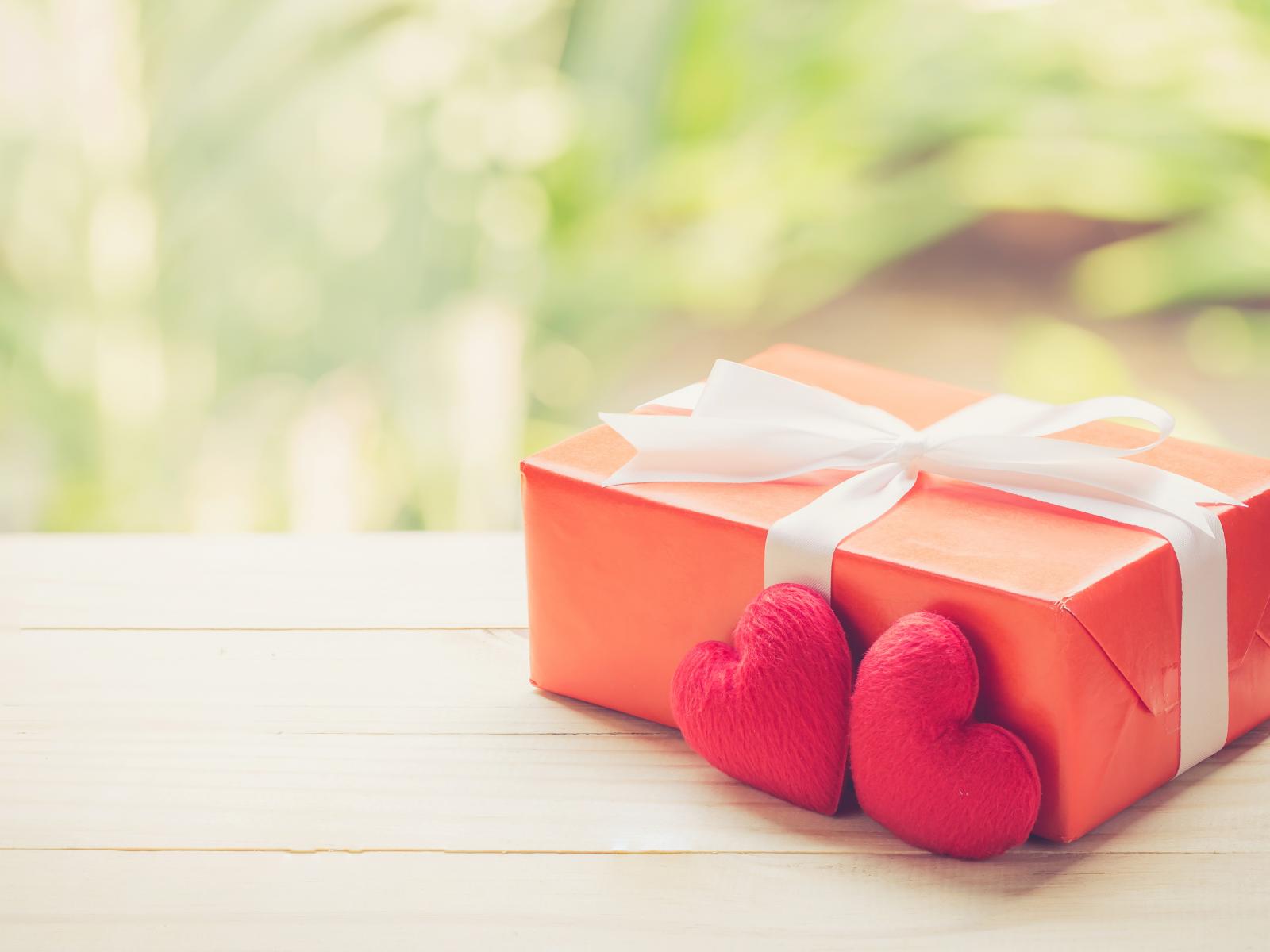 Wallpaper A gift in a red box on a white background with red hearts and a red rose, a gift for a loved one on February 14