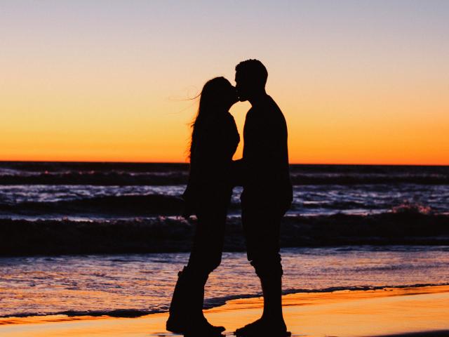 Wallpaper Kiss of a loving couple on the beach at sunset