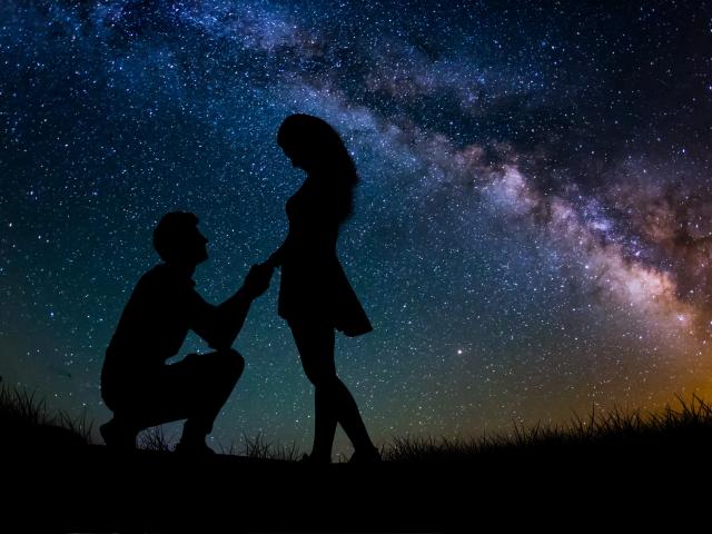 Wallpaper Silhouettes of a couple in love against the starry sky at night