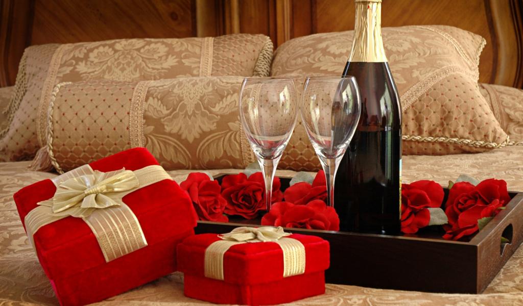 Wallpaper A bottle of wine, two glasses and gifts for a romantic evening on the bed