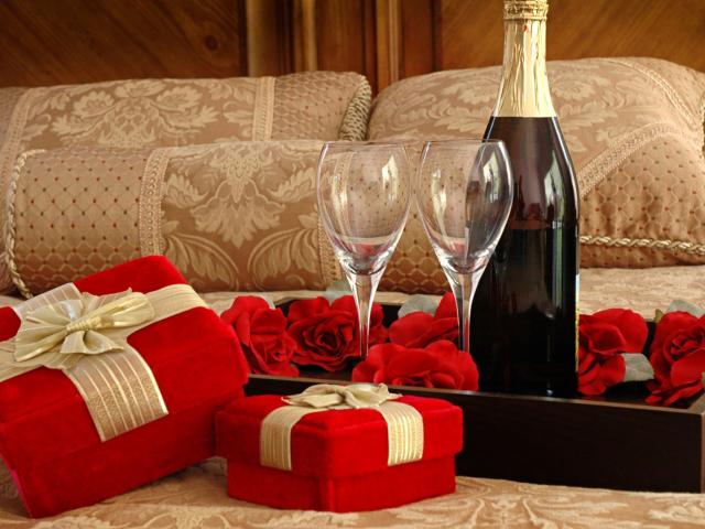 Wallpaper A bottle of wine, two glasses and gifts for a romantic evening on the bed