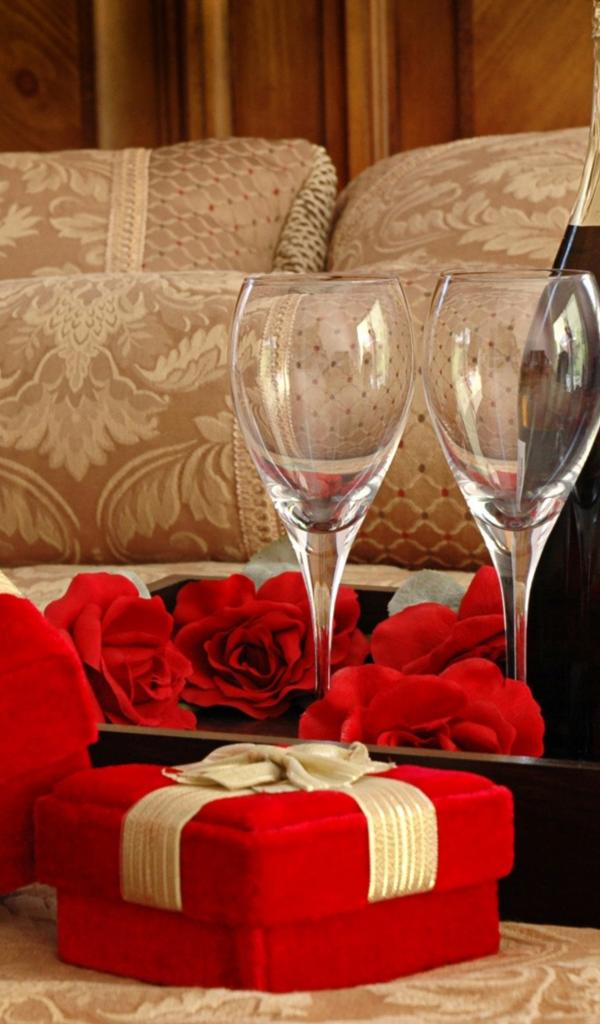 Wallpaper A bottle of wine, two glasses and gifts for a romantic evening on the bed