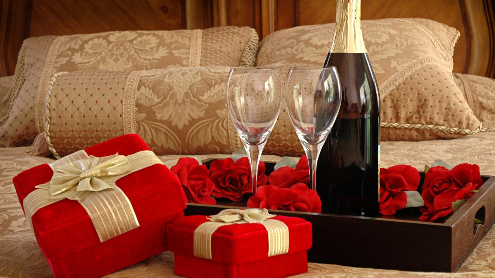 Wallpaper A bottle of wine, two glasses and gifts for a romantic evening on the bed