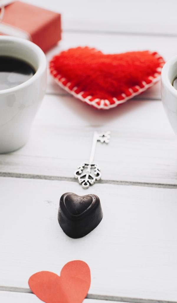 Wallpaper Two cups of coffee on the table with gifts, sweets and hearts