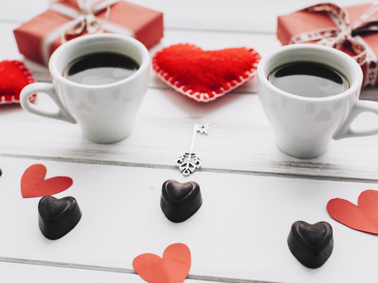 Wallpaper Two cups of coffee on the table with gifts, sweets and hearts