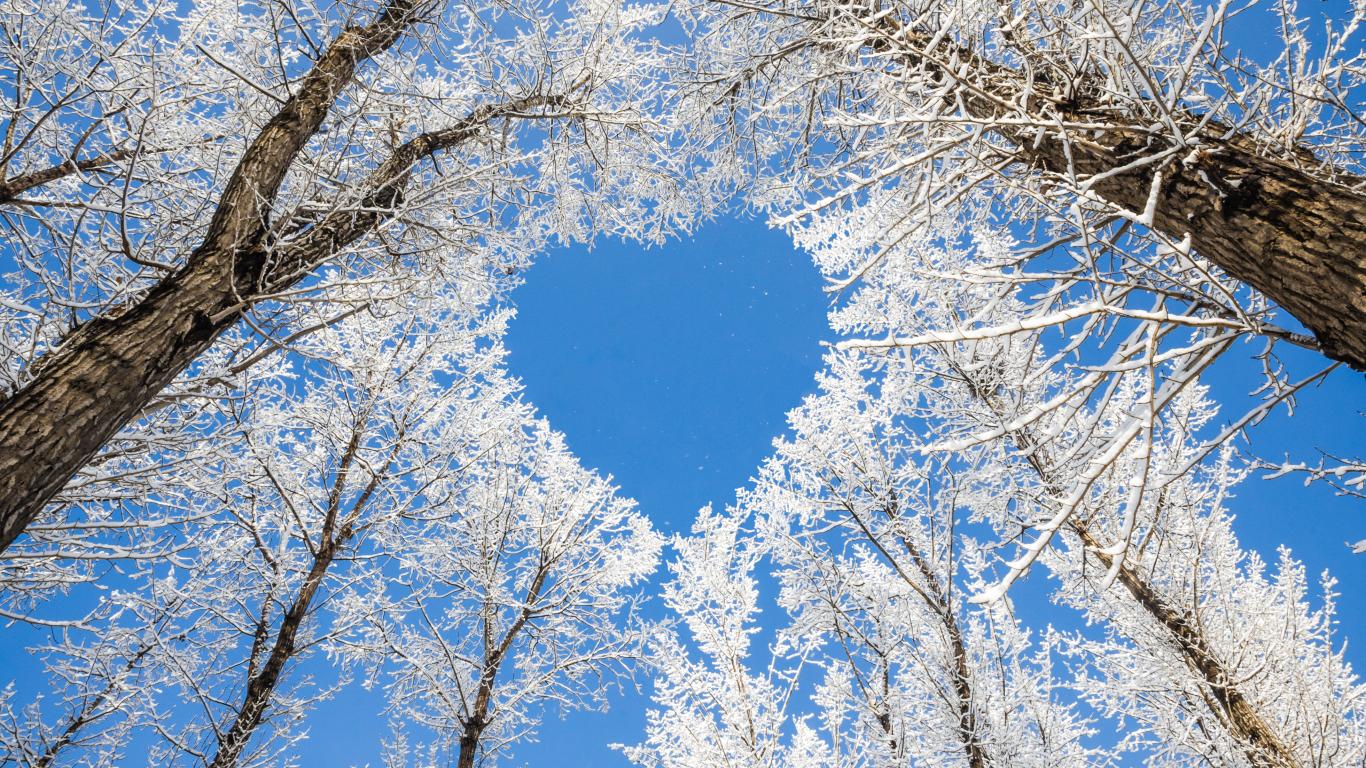 Wallpaper Crowns of frost-covered trees give a heart against the blue sky