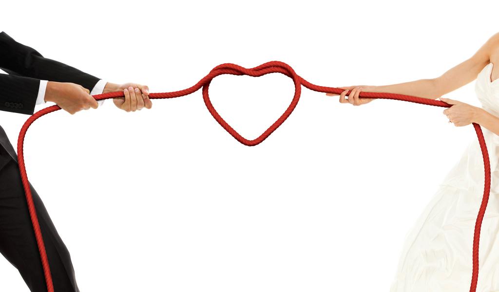 Wallpaper Newlyweds pull a rope with a heart on a white background