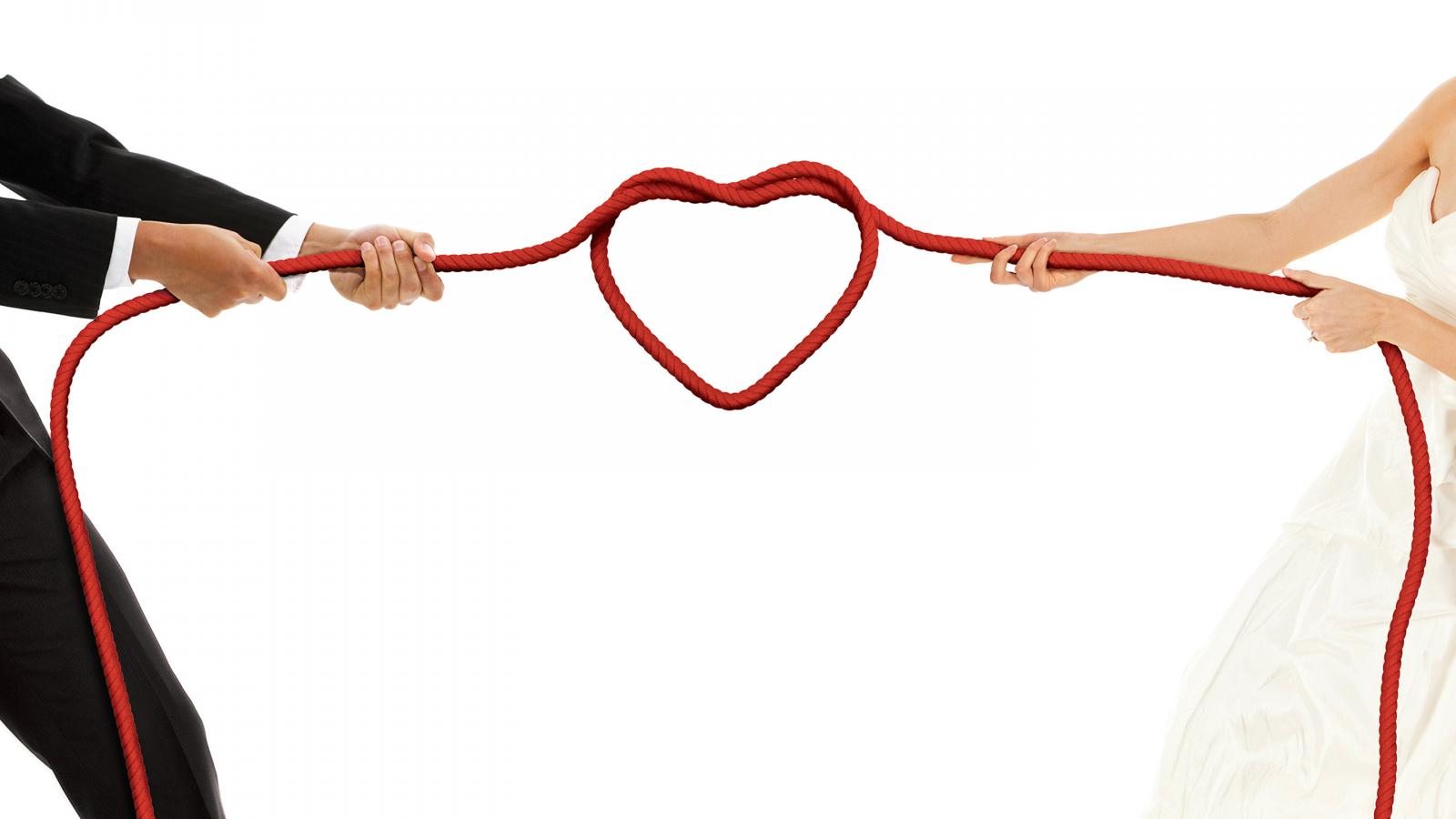 Wallpaper Newlyweds pull a rope with a heart on a white background