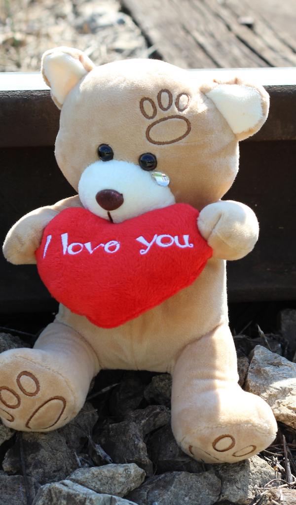 Wallpaper Toy bear with a red heart sitting on the rails