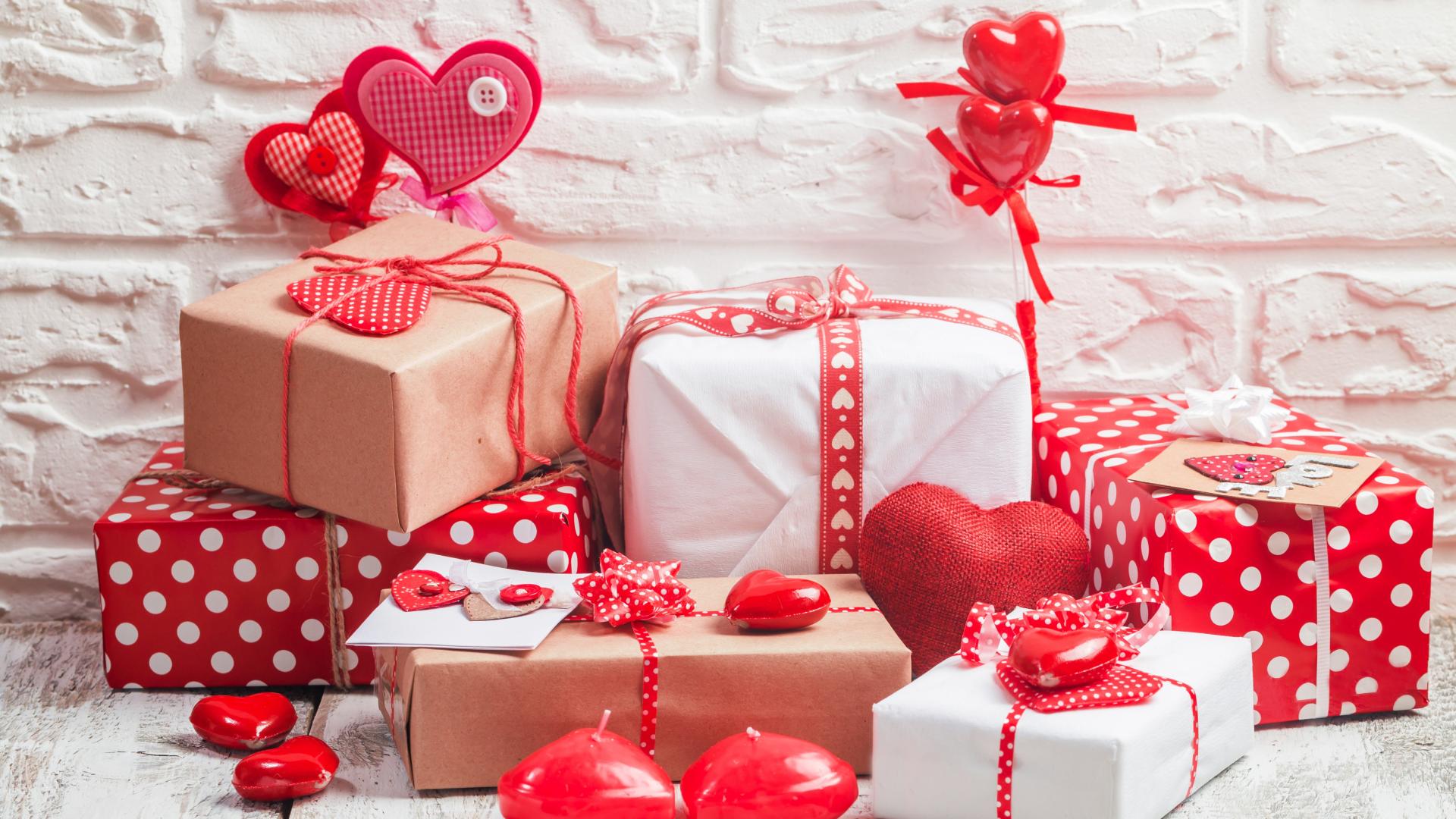 Wallpaper Many gift boxes with hearts on the background of the wall