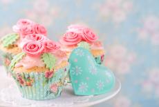 Wallpaper Appetizing capkakes with pink roses made of mastic and heart