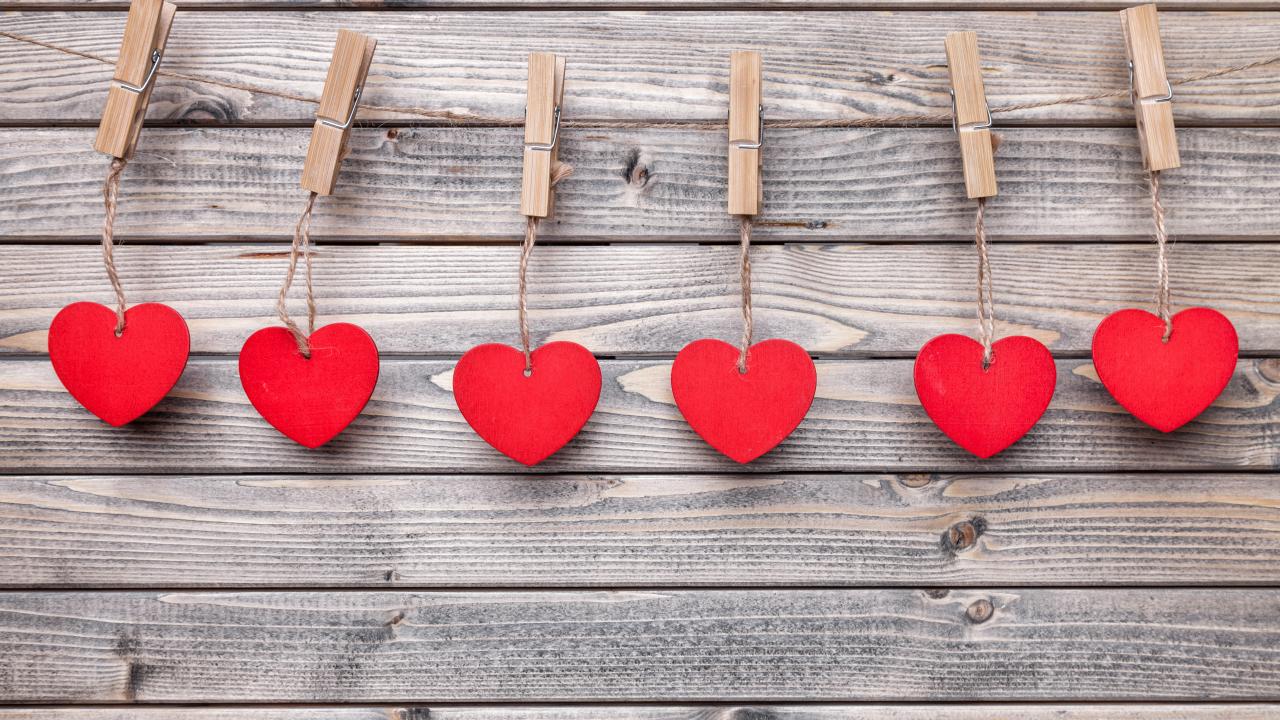 Wallpaper Red hearts on clothespins on a wooden table