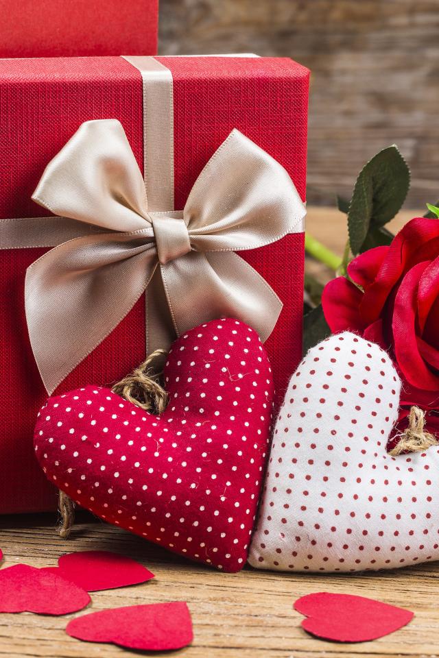 Wallpaper Two soft hearts on the table with a gift and roses for the beloved