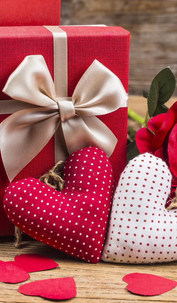 Wallpaper Two soft hearts on the table with a gift and roses for the beloved