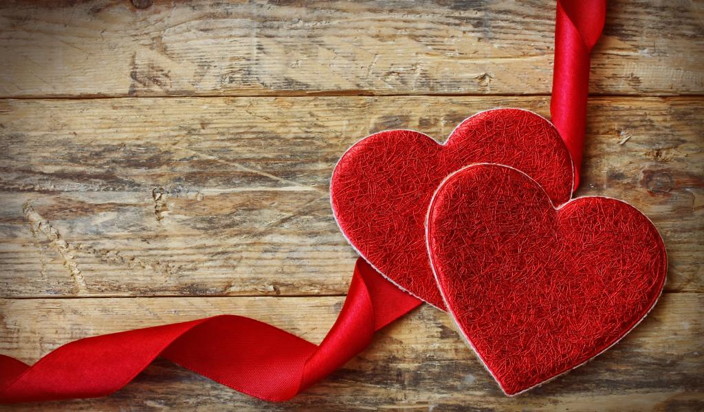 Wallpaper Two hearts with a red ribbon on a wooden table