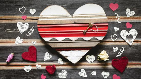 Wallpaper Wooden heart with paper hearts on the table