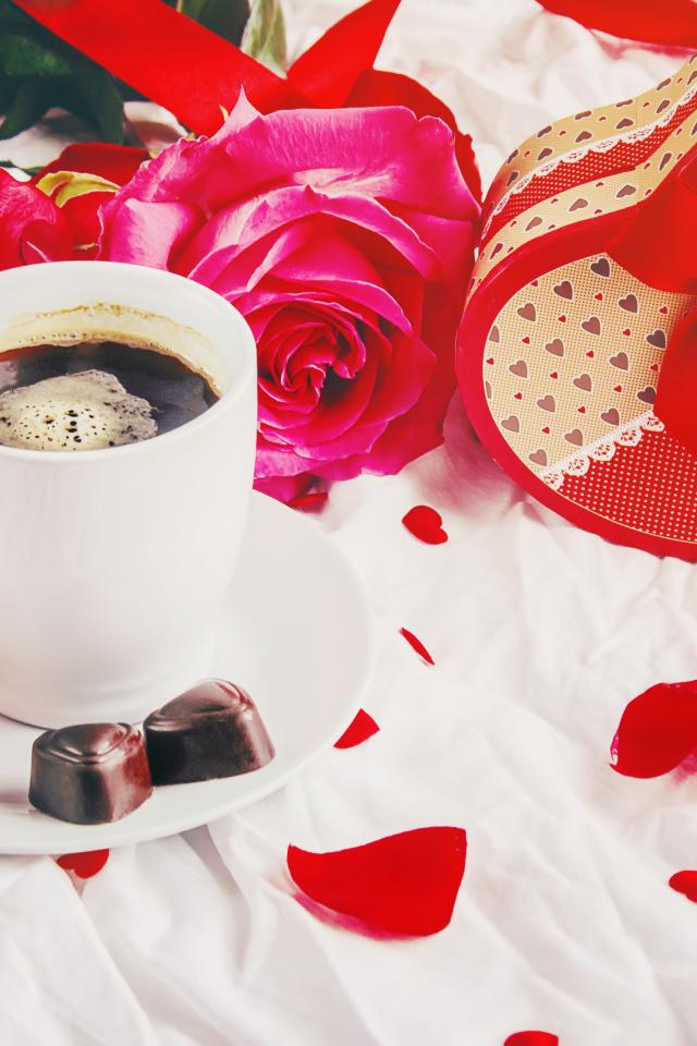 Wallpaper Heart-shaped box on white cloth with a cup of coffee and roses