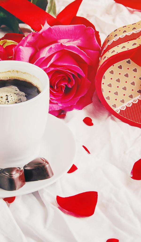 Wallpaper Heart-shaped box on white cloth with a cup of coffee and roses