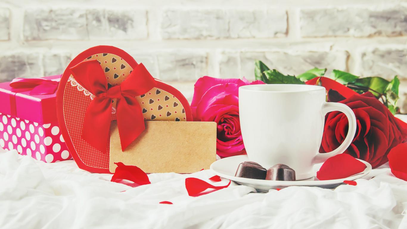 Wallpaper Box with a gift on the table with a cup of coffee and red roses